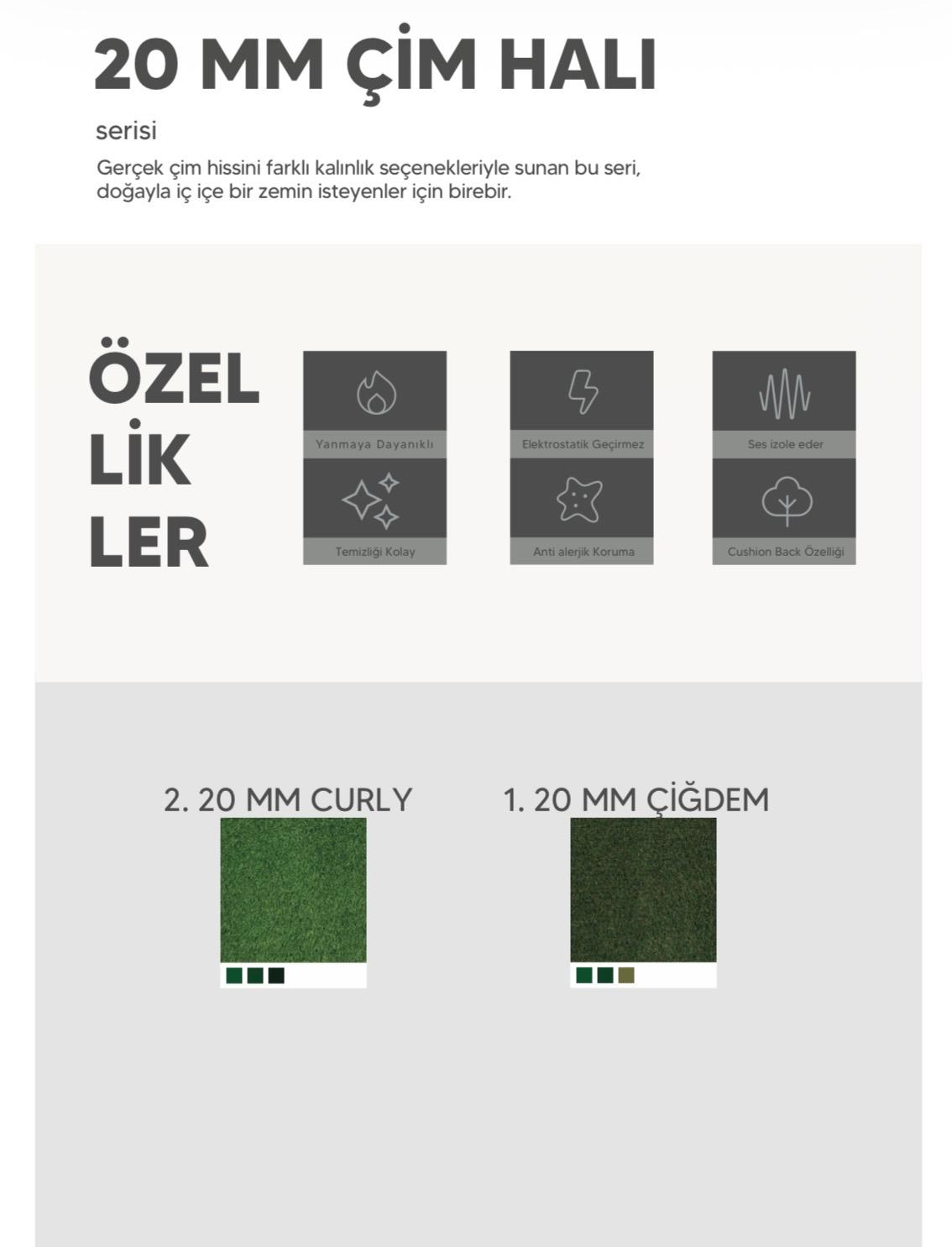 Gerçek çimin kıvırcık, gür ve dolgun dokusunu taklit eden bu özel seri, bahçenizden balkonunuza, çocuk oyun alanlarından ticari projelere kadar her yerde benzersiz bir doğallık ve konfor vadediyor.