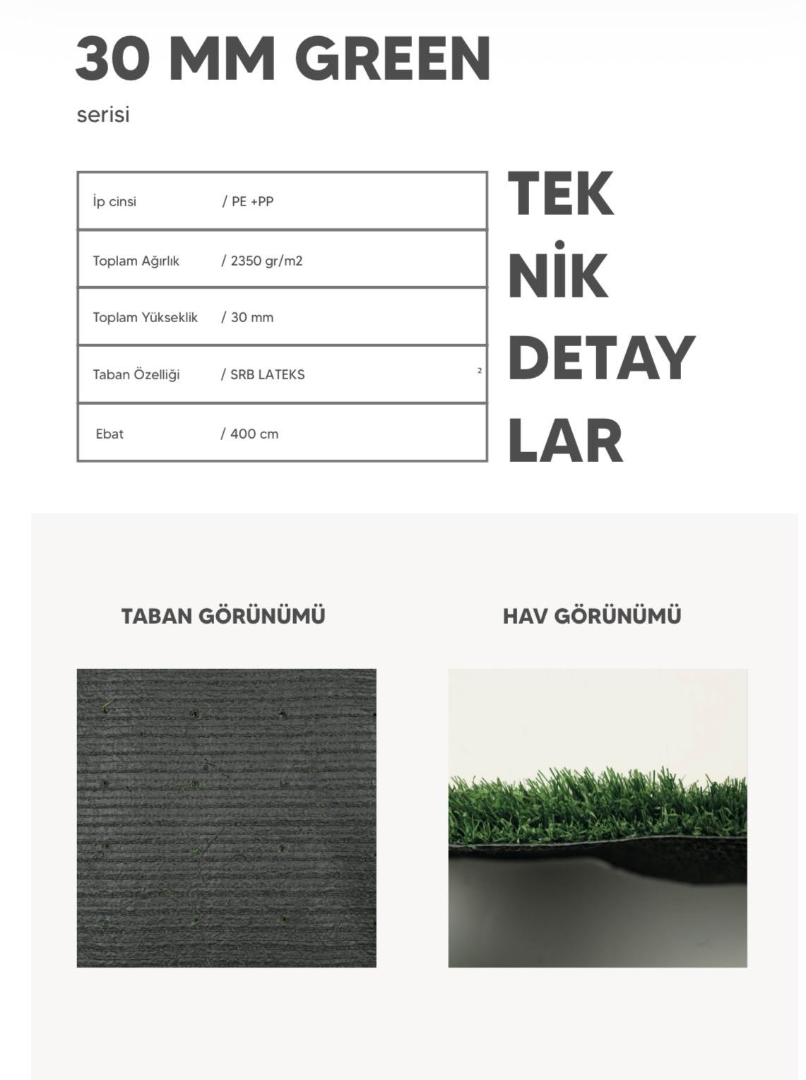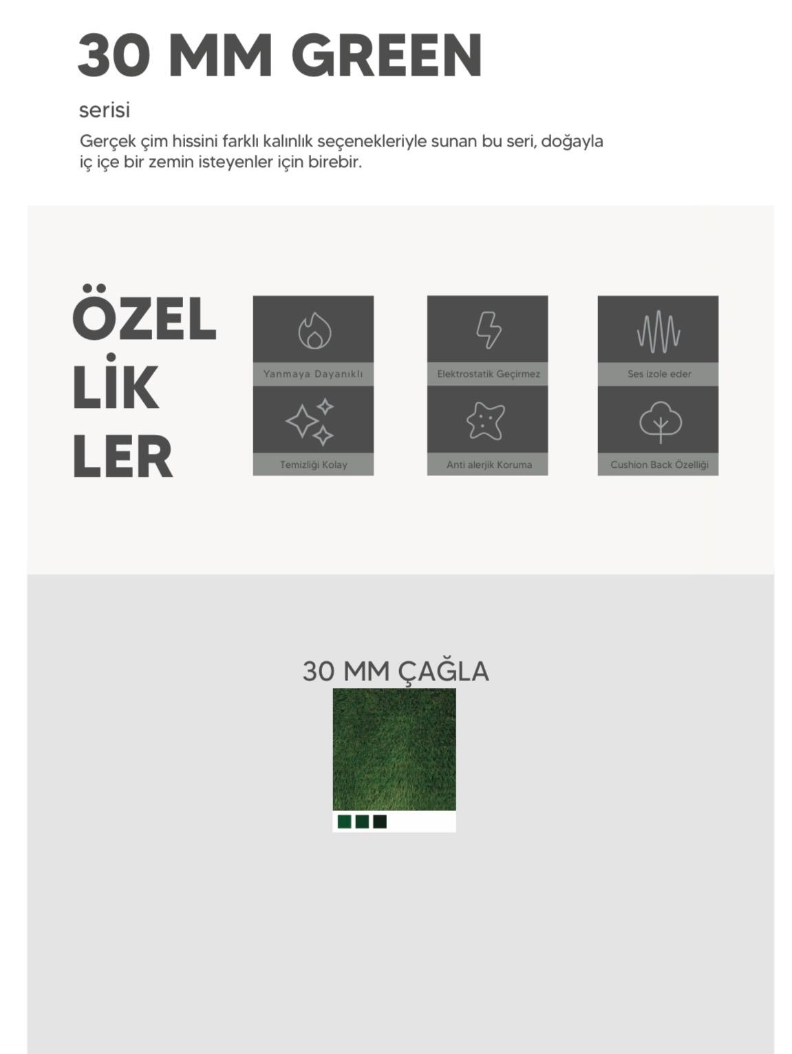 30 MM Çağla serisi; bahçe peyzajları, teraslar, cafe/restoran dış mekanları ve çocuk oyun alanları için ideal bir çözümdür. Doğal yeşil tonuyla doğayla iç içe bir atmosfer yaratmak isteyenler için birebirdir.